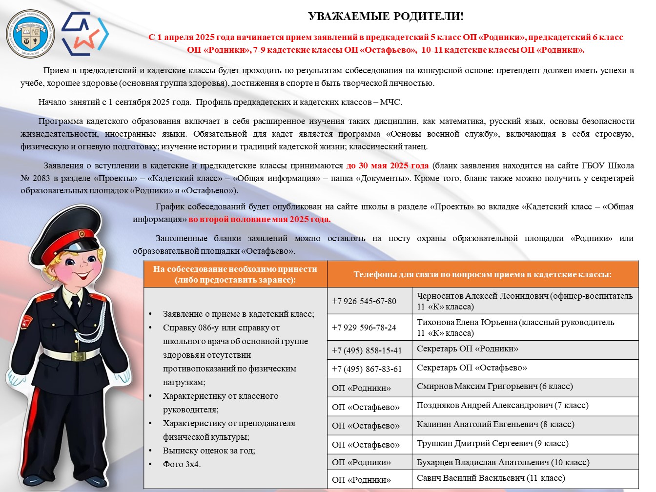 ❗️С 1 апреля 2025 года начинается прием заявлений в предкадетский 5 класс ОП «Родники», предкадетский 6 класс ОП «Родники», 7-9 кадетские классы ОП «Остафьево», 10-11 кадетские классы ОП «Родники»❗️