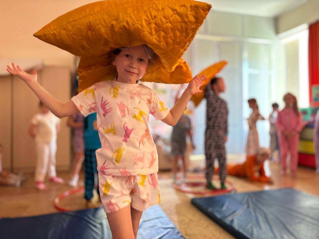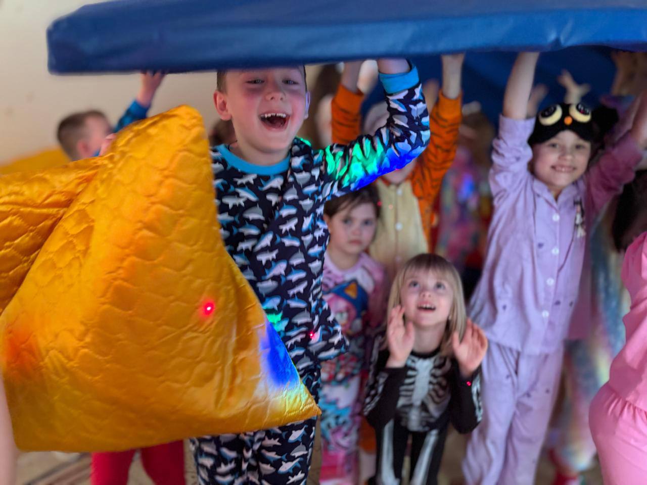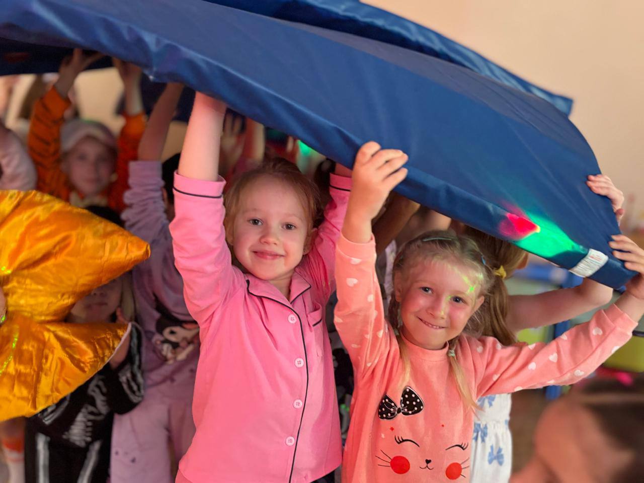 Море веселья ждало ребят с первых минут праздника. Энергичные танцы сменялись забавными играми с подушками, модный показ в пижамах – увлекательными «сонными прятками». Время летело незаметно в потоке смеха и радости!
