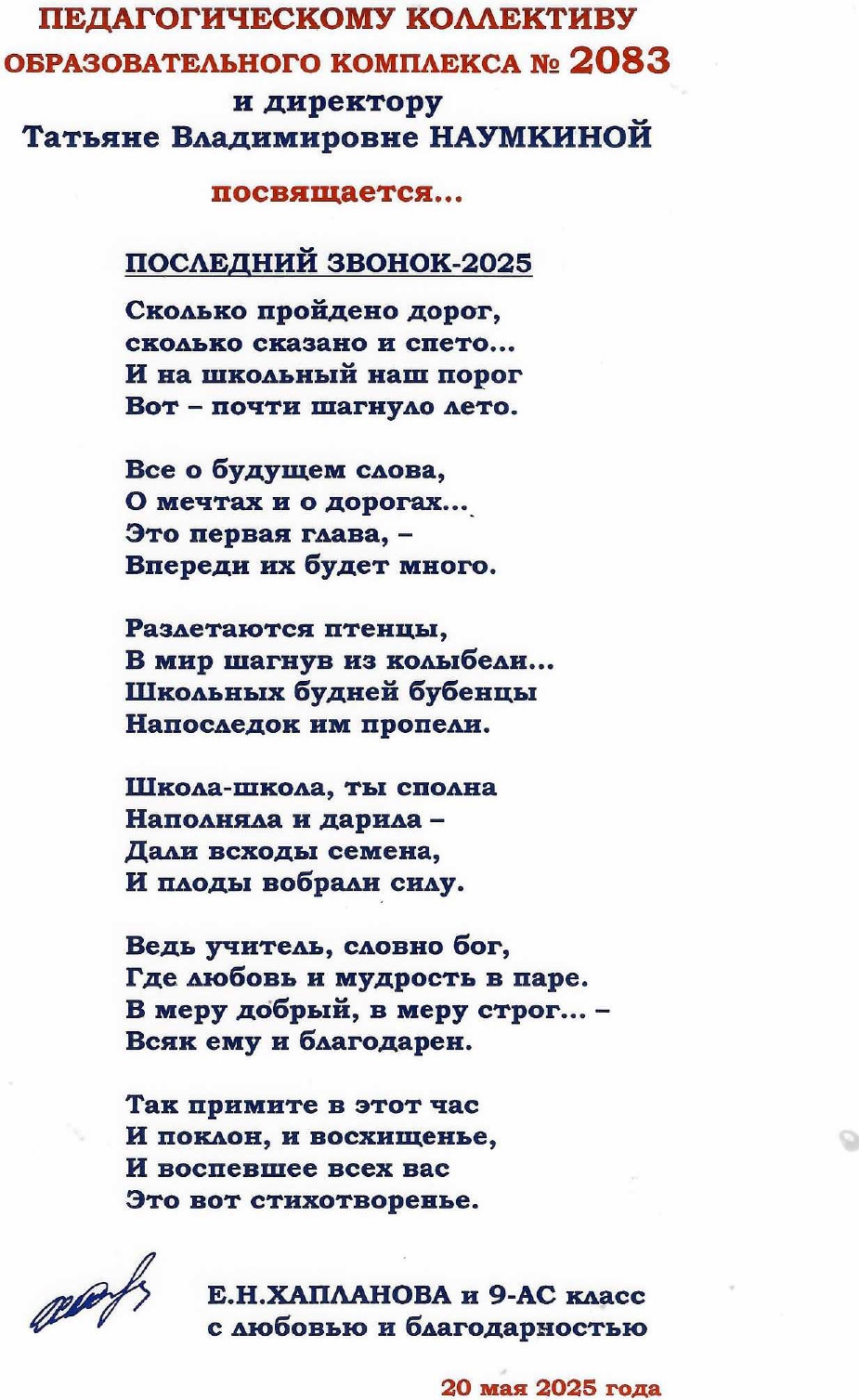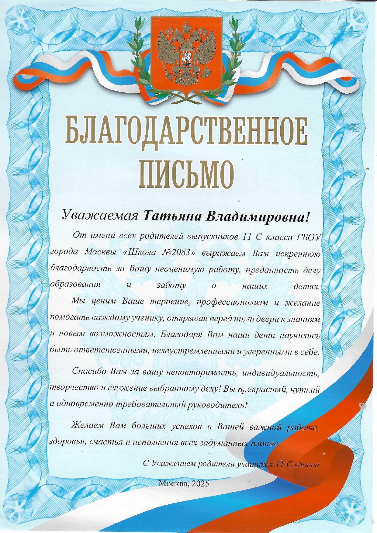 Благодарственное письмо директору и педагогическому коллективу от имени родителей выпускников 11 «С» класса